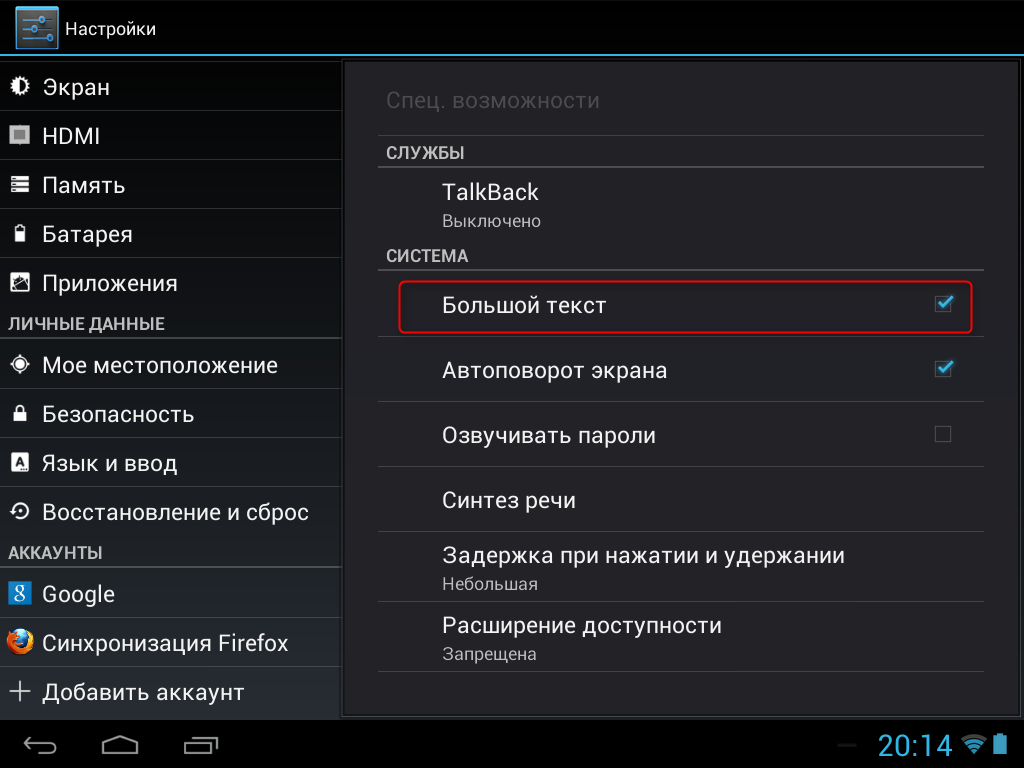 Операционная система Android включает в себя ряд специальных возможностей для людей с нарушениями зрения и слуха. В частности, самая полезная функция для тех, кто испытывает проблемы с мелкими буквочками, скрывается в меню настроек в разделе Специальные возможности. Отметьте здесь опцию Большой текст и все станет гораздо виднее.