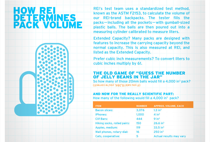 Теперь нужно определиться с объёмом самого рюкзака. Объем туристических рюкзаков измеряется в литрах и колеблется от 60 до 150. Как выбрать нужный объем? Если купить слишком маленький рюкзак, может случиться так, что придется навешивать часть снаряжения снаружи или таскать на груди маленький рюкзачок («кенгурятник»), что будет весьма неудобно или тащить что-то в руках, что совсем плохо. Но и покупать слишком большой рюкзак также не стоит (иначе вам всегда найдут, что в него положить и рюкзак будет слишком тяжелым).Как правило, рекомендуют использовать следующие объёмы: Для школьников — 60-70 литров. Для девушек — 80-100 литров. Для мужчин — 100-120. Если вам он и покажется слишком большим, стоит помнить, что его всегда можно утянуть лямками (сделав из 120-литрового рюкзака литров 80). Следует учесть и то, если вы привыкли носить каремат (туристический коврик-пенку) внутри рюкзака, она будет «съедать» около 5-10 литров объема из-за не полного соответствия рюкзака форме цилиндра.
