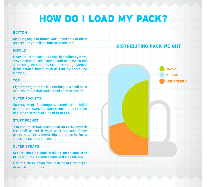 Тяжелые предметы размещают внизу и посередине, к спине лучше положить что нибудь мягкое, например спальный мешок.Предметы, которые легко мнутся и ломаются, кладут на самый верх. Документы, медикаменты и прочие нужные мелочи раскладываются по карманам. Все предметы укладываются плотно, чтобы вещей вошло как можно больше. Каждую группу вещей лучше разложить по отдельным плотным пакетам. Чем меньше предметов в каждом пакете, тем проще потом отыскать нужное. Сыпучие продукты (сахар, крупа, сухое молоко) удобно переносить в бутылках из пластика, поскольку пакеты легко повредить.