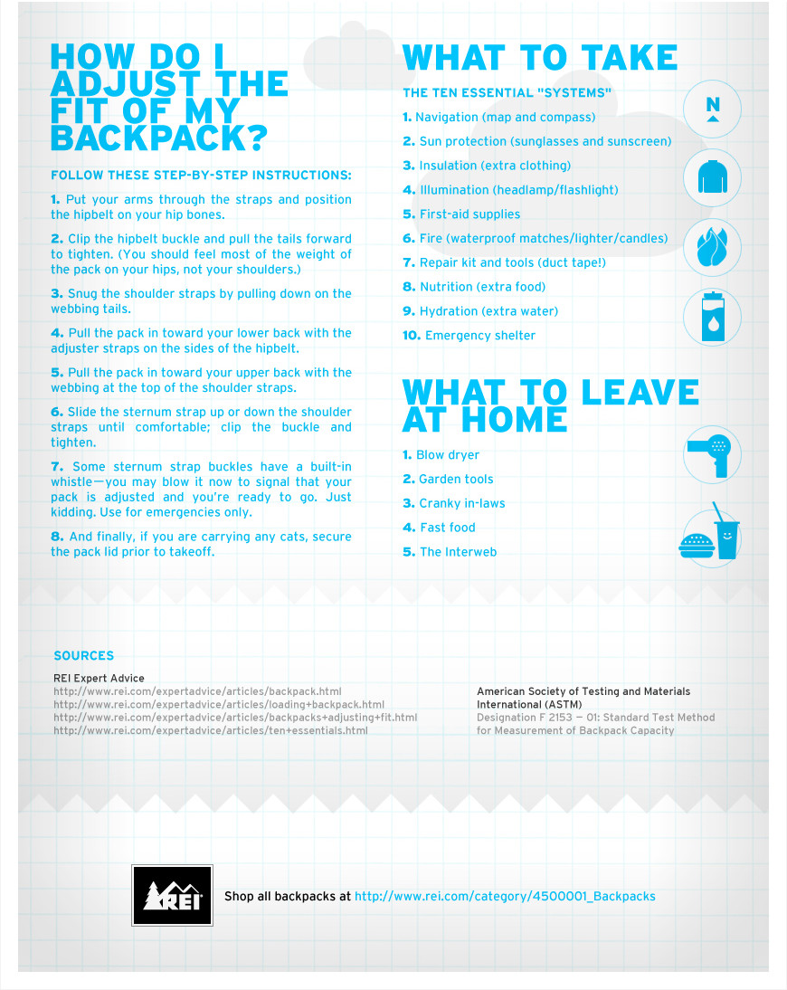 Миску, кружку, ложку и прочие металлические предметы лучше разместить в разных частях рюкзака, чтобы при ходьбе они не стучали друг о друга. Постарайтесь плотно заполнить каждую свободную щелочку, чтобы вещи не смещались при тряске. Самые тяжеловесные предметы укладывают таким образом, чтобы их вес приходился на зону между лопатками.