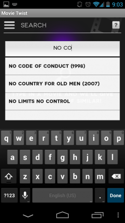 Теперь непосредственно о поиске. Доступен стандартный поиск по названию с автодополнением. На основе уже первого вбитого запроса приложение выдаст несколько страниц похожих фильмов.