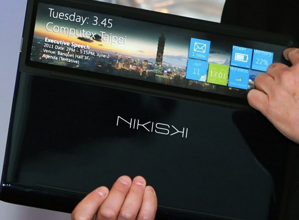 На нее будет выведено особое меню, открывающее быстрый доступ к некоторым программным функциям Nikiski – календарю, контроллеру аккумулятора, вэб-браузеру, почтовому клиенту, социальным сетям. Управлять же всем этим можно будет через обратную сторону прозрачного тачпада, также реагирующую на прикосновения.