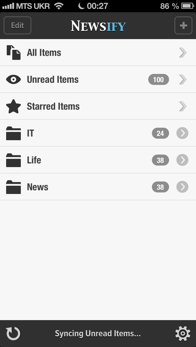 Зайдя в приложение, вы сразу же видите главный экран, который представляет собой сборник подписок, которые можно распределить по папкам, все новости, непрочитанные и избранные материалы. С этого экрана можно управлять своими фидами, удалять, перемещать и переименовывать их, а также обновлять подписки вручную, что в принципе никогда не понадобится, так как программа делает это автоматически при включении.