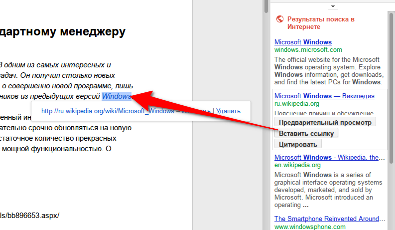 Здесь все предельно ясно. Вы просто вводите в строку поиска свой запрос или выделяете слово в тексте и используете соответствующую команду в контекстном меню и тут же получаете результаты. С помощью выпадающего списка можно фильтровать результаты по таким категориям: Картинки, Академия, Цитаты, Словарь и Личные. При наведении мышки появляется кнопка Предварительный просмотр, с помощью которой можно увидеть уменьшенную копию страницы.2. Вставка ссылок