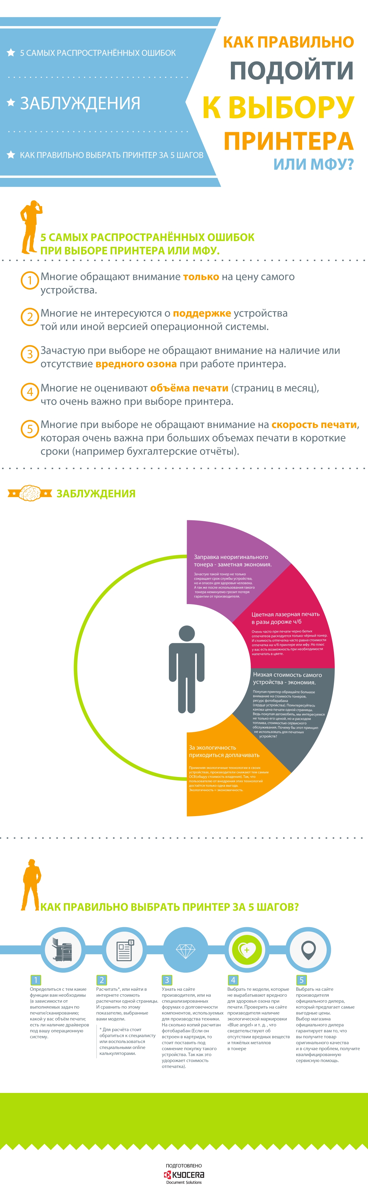 Вопрос выбора правильного принтера или МФУ — довольно сложная тема, и вещи, которые кажутся очевидными бывалому сотруднику ИТ-отдела, могут удивить простого человека, столкнувшегося с необходимостью самостоятельного выбора и покупки печатающего устройства. На что обращать внимание? Какие вопросы задавать консультанту в компьютерном магазине? Как правильно эксплуатировать купленный аппарат, чтобы он работал долго и исправно? На эти ключевые вопросы ответит инфографика, присланная одним из наших читателей.
