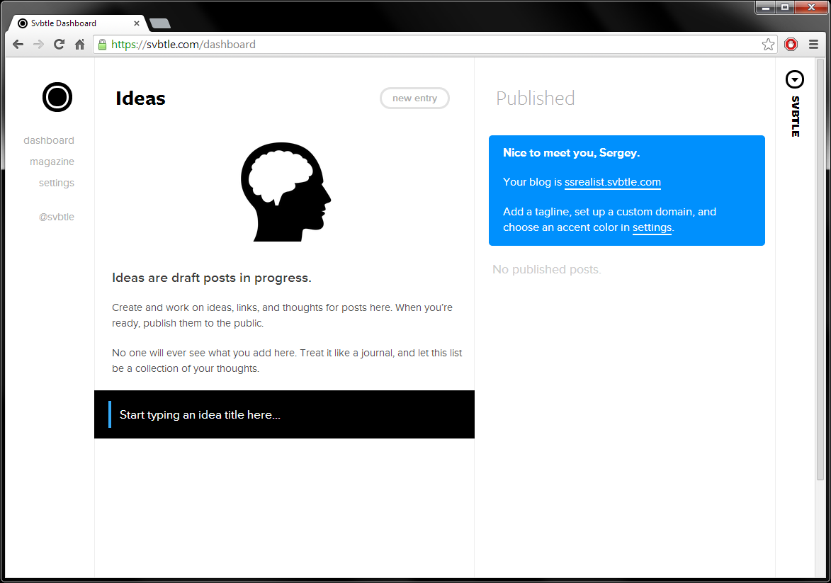 Рубрика «Как сделать сайт» от Лайфхакера продолжается. Всевозможных площадок и инструментов для размещения личного или корпоративного блога существует великое множество. Хочешь — ставь WordPress на хост, покупай домен и делай там всё, что пожелает душа. Не хочешь — обходись готовым бесплатным инструментом. Сегодня мы расскажем о самой простой и минималистичной, из знакомых нам, площадке для размещения блога под названием Svbtle.