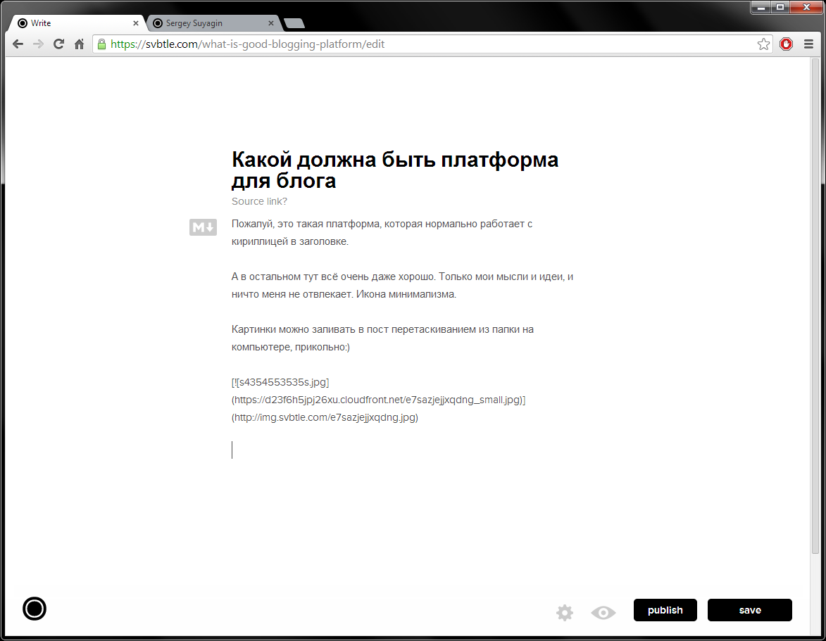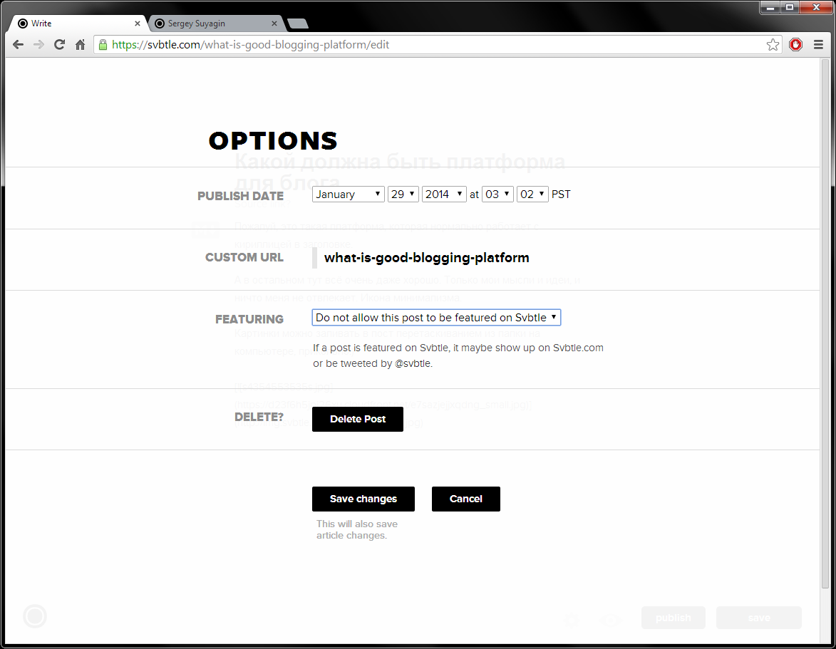 Тут нам встретился баг: если вы начали писать заголовок поста на кириллице, то, при попытке автосохранения, система начнёт ругаться на пустой пермалинк (из заголовка формируется ссылка на пост, но пока Svbtle не умеет сам проводить транслитерацию). Этот баг обходится просто: сперва называем пост любыми латинскими или цифровыми символами, жмём «Save idea», и уже затем меняем текст заголовка на русский. То, что пермалинк при этом получился корявый — не беда, перед публикацией его можно поменять через настройки публикации.
