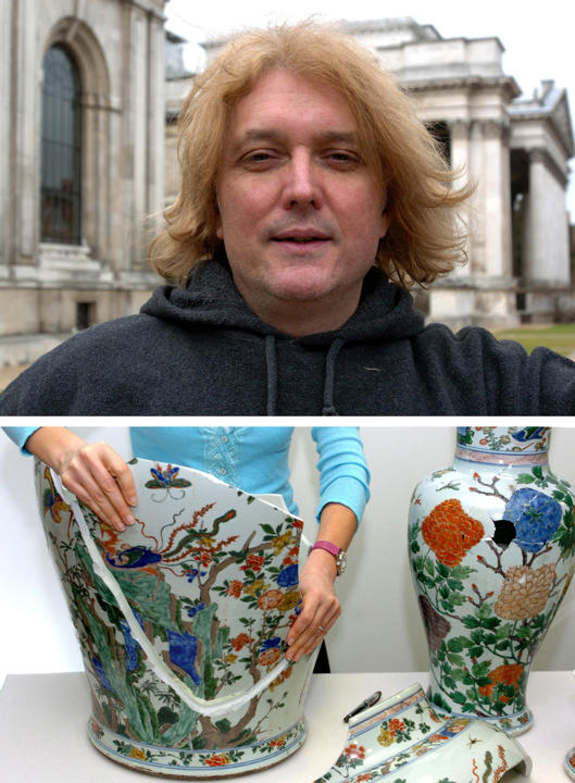 А потом в музей вошёл посетитель, 42-х летний мужчина по имени Ник Флинн. Позднее он заявлял журналистам, что просто ошибся лестницей. Когда он это понял, и повернулся, чтобы спуститься обратно, он наступил на развязавшийся шнурок своего ботинка. Наступив на шнурок, он свалился с лестницы и угодил головой прямо в вазы династии Цинь, разбив их на сотни мелких кусочков. Флинн быстро взял себя в руки, поднялся с пола, и ушёл из музея. Но перед этим его успели сфотографировать на фоне осколков ваз. Позднее Флинна нашли и арестовали, обвинив его в нанесении материального ущерба в особо крупном размере.