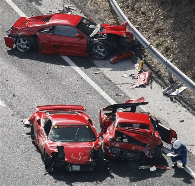 В декабре 2011-го года, в префектуре Ямагути (Япония) группа владельцев экзотических автомобилей решила прокатиться после автомобильной выставки. Всё шло гладко, пока один джентльмен на Ferrari F430 не попытался обогнать автомобиль Toyota Prius, который ехал по скоростной полосе, но скорость которого была не слишком высока. Водитель Ferrari не справился с управлением и врезался в ограждение. В него врезались все, кто ехал следом. В результате в аварию попали семь других Ferrari, среди которых были F360 Modena, F355, и белая Testarossa. Также пострадала одна Lamborghini Diablo, и несколько «Мерседесов» представительского класса. И хотя травмы, полученные водителями машин, были довольно лёгкими, общая сумма ущерба от аварии превысила 4 млн $.