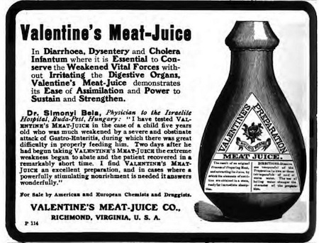 К сожалению, чудо-свойства «Мясного сока Валентайна» оказались обманкой — в 1909-м году Американская медицинская ассоциация обратила внимание на сумасшедшую популярность напитка и её специалисты произвели тщательный анализ состава этого продукта. Выяснилось, что «Сок» — не что иное, как разбавленный мясной бульон, в котором практически нет питательных веществ и витаминов. Самую большую пользу он принёс своему создателю — с продаж напитка семья Валентайнов получила огромную прибыль.